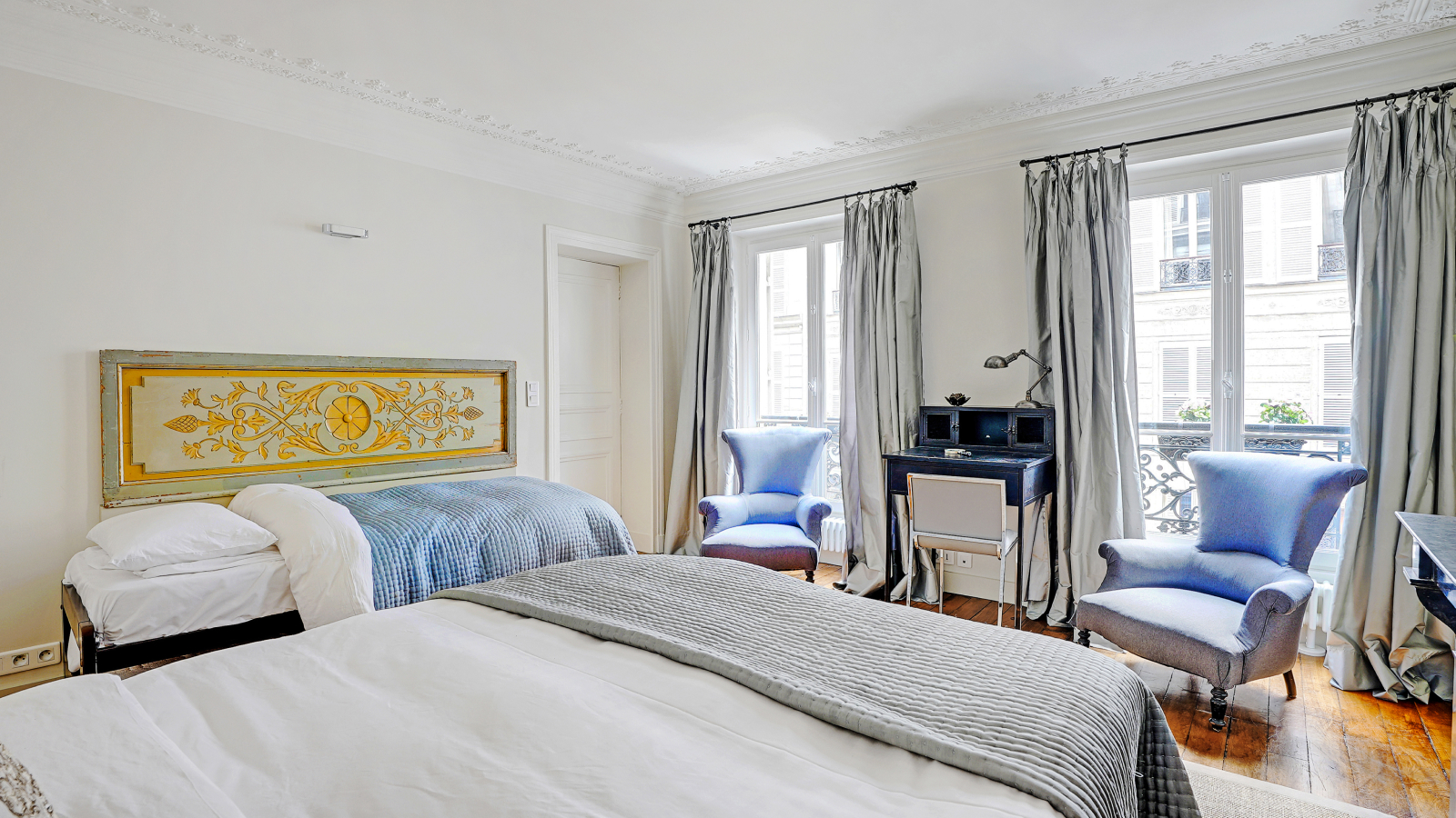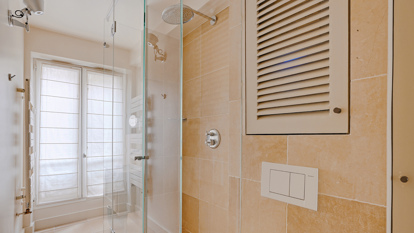 Located on the first floor of this 18th-century building on Rue Malher in Paris, a spacious and elegant apartment, defined by high ceilings, generous proportions, and refined Parisian character, awaits. The layout is ideal for travelling with friends or family, with two well-appointed bedrooms, each with its own private bathroom, ensuring comfort and privacy. The bathrooms are finished in warm neutral tones and comprise walk-in showers.