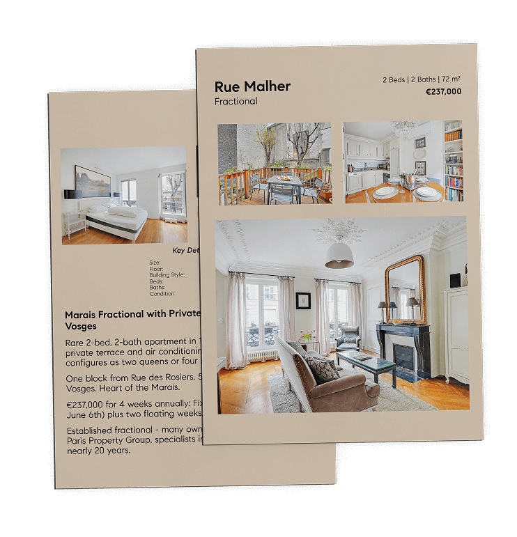 Rue Malher by Paris Property Group is sold in Euros. While this website may automatically convert to/from $ and £ at a preselected rate, to ensure transparency and stability, the current price is €237,000 per 1/12 share.